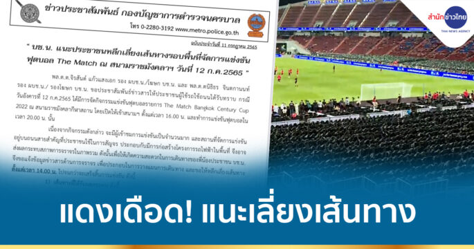 บช.น. แนะประชาชนหลีกเลี่ยงเส้นทางรอบพื้นที่จัดการแข่งขันฟุตบอล THE MATCH Bangkok Century Cup 2022 ณ สนามราชมังคลากีฬาสถาน หัวหมาก วันนี้ (12 ก.ค.65)