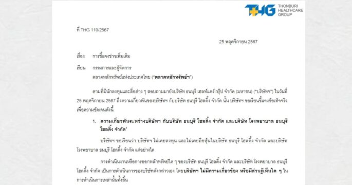บมจ.ธนบุรี เฮลท์แคร์ กรุ๊ป (THG) ยืนยันไม่เกี่ยวข้องในบริษัท ธนบุรี โฮลดิ้ง และบริษัท โรงพยาบาล ธนบุรี โฮลดิ้ง ไม่มีส่วนรู้เห็นกับการออกหลักทรัพย์ ล่าสุดพบรายการน่าสงสัยเพิ่มเติม 63 ลบ. ตั้งสำรองแล้วในรายการน่าสงสัย 172 ลบ. ใน Q3/67 และจะดำเนินคดีกับอดีตผู้บริหาร-พนักงานให้ชดใช้ความเสียหาย