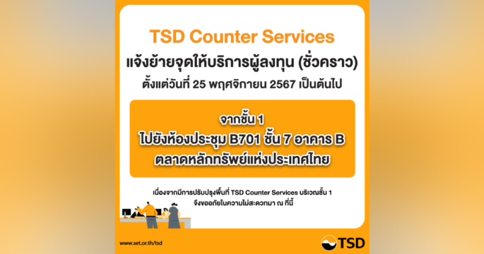 กรุงเทพฯ 20 พ.ย.- TSD Counter Services แจ้งย้ายจุดให้บริการชั่วคราวที่ ชั้น 7 อาคาร B ตลาดหลักทรัพย์ฯ ตั้งแต่ 25 พ.ย. 2567 เป็นต้นไป เนื่องด้วย TSD Counter Services มีกำหนดปรับปรุงพื้นที่ให้บริการบริเวณชั้น 1 อาคาร B ตลาดหลักทรัพย์แห่งประเทศไทย จึงขอแจ้งการย้ายจุดให้บริการผู้ลงทุน ไปยังห้องประชุม B701 ชั้น 7 อาคาร B ตลาดหลักทรัพย์แห่งประเทศไทย เป็นการชั่วคราว ตั้งแต่วันที่ 25 พฤศจิกายน 2567 เป็นต้นไป ทั้งนี้ ผู้ลงทุนสามารถเลือกทำธุรกรรมออนไลน์ผ่าน Investor Portal ได้อีกหนึ่งช่องทาง ที่www.set.or.th/th/tsd/services/investors/e-services/investor-portal อาทิ ทำธุรกรรมแก้ไขข้อมูลในฐานทะเบียนผู้ถือหลักทรัพย์ สมัครหรือเปลี่ยนแปลงข้อมูล e-Dividend ตรวจสอบยอดหุ้น เงินปันผล เอกสารส่งออกหรือตีคืน สั่งพิมพ์รายงานหนังสือรับรองการหักภาษี ณ […]