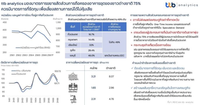 กรุงเทพฯ 27 มิ.ย. – ttb analytics มองมาตรการขยายการถือครองอาคารชุดของชาวต่างชาติเป็น 75% หากไม่รัดกุม จะมีผลตามมาเป็นคลื่นที่ไม่รู้จบ (Unceasing Waves) ทั้งราคาที่ปรับเพิ่มสูงกว่ากำลังซื้อของคนในประเทศ กระทบธุรกิจที่เกี่ยวข้อง แนะควรมีมาตรการที่รัดกุม เข้มงวด ชัดเจน ไม่ให้กระทบคนรุ่นหลัง ศูนย์วิเคราะห์เศรษฐกิจ ทีทีบี หรือ ttb analytics เปิดเผยว่า ภายใต้แรงกดดันที่ถาโถมในอุตสาหกรรมอสังหาริมทรัพย์ที่อยู่อาศัยทั้งจากฝั่งอุปสงค์ที่แรงซื้อลดลงจาก “คนซื้อน้อยลง การเข้าถึงสินเชื่อที่ยากขึ้น และคนรุ่นใหม่ปราศจากเงินออมในจำนวนที่เพียงพอ” กอปรกับฝั่งอุปทานก็ไม่สามารถทำการตลาดเพื่อช่วยให้รองรับการอ่อนตัวของอุปสงค์จากสถานการณ์ที่ “ต้นทุนก่อสร้างแพงขึ้น ระยะเวลาขายที่ช้าลง และราคาที่ไม่สามารถลดได้เพื่อรักษาภาพลักษณ์การเป็นสินทรัพย์ที่รักษามูลค่าได้” กดดันให้ตลาดที่อยู่อาศัยหดตัวหนักกว่าที่เคยคาดไว้ โดยประเมินตลาดที่อยู่อาศัยปี 2567หดตัว13.6% มีจำนวนหน่วยโอนอยู่ที่ 3.17 แสนหน่วย ในขณะที่มูลค่าโอนหดตัวถึง 15.9% เหลืออยู่ที่ 8.8 แสนล้านบาท อย่างไรก็ตาม ประเด็นที่น่ากังวลเป็นพิเศษในปี 2567 ต่อเนื่องถึงปี 2568 เป็นในส่วนของตลาดอาคารชุด ที่นอกจากเผชิญแรงกดดันจากโครงสร้างทั้งฝั่งอุปสงค์และอุปทานที่กระทบต่ออุปสงค์จริง (Real Demand) ในช่วงที่ผ่านมาตลาดอาคารชุดยังประสบปัญหาเรื่องผลตอบแทนจากการลงทุน โดยเฉพาะในพื้นที่ กรุงเทพมหานครและปริมณฑล ที่คิดเป็นสัดส่วนราว […]