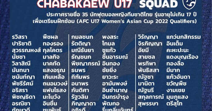 สมาคมกีฬาฟุตบอลแห่งประเทศไทย ในพระบรมราชูปถัมภ์ ประกาศรายชื่อ 35 นักฟุตบอลหญิงทีมชาติไทย รุ่นอายุไม่เกิน 17 ปี ที่ผ่านการคัดเลือก เพื่อเตรียมฝึกซ้อม ก่อนการแข่งขันฟุตบอลหญิงชิงแชมป์เอเชีย รอบคัดเลือก (AFC U17 Women’s Asian Cup 2022 Qualifiers) ซึ่งมีกำหนดแข่งขันในปี 2564 มีรายชื่อดังต่อไปนี้ เด็กหญิงรวิสรา พืชผล สังกัด โรงเรียนกีฬาจังหวัดนครศรีธรรมราช เด็กหญิงปาริชาติ ทองรอง สังกัด โรงเรียนกีฬาจังหวัดนครศรีธรรมราช เด็กหญิงสุวรรณหงส์ กุลโคตร สังกัด โรงเรียนกีฬาจังหวัดขอนแก่น เด็กหญิงนัชชา มาลกิจ สังกัด โรงเรียนกีฬาจังหวัดขอนแก่น เด็กหญิงวิลาสิณี นาคทัด สังกัด โรงเรียนกีฬาจังหวัดขอนแก่น เด็กหญิงมันทนา แสงอรุณ สังกัด โรงเรียนกีฬาจังหวัดขอนแก่น เด็กหญิงชนันท์ญา เกินเหลือ สังกัด โรงเรียนกีฬากรุงเทพมหานคร เด็กหญิงพัชรีรัศม์ ถนอมวงษ์ สังกัด โรงเรียนกีฬากรุงเทพมหานคร เด็กหญิงอริสรา […]
