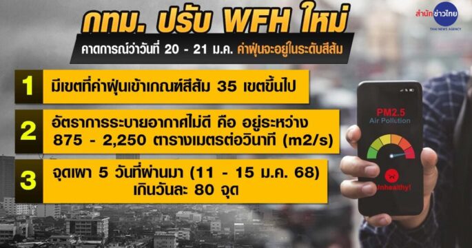 กทม. ประกาศขอความร่วมมือ WFH ตามมาตรการวาระแห่งชาติ PM 2.5 จากการคาดการณ์แนวโน้มฝุ่นจะมีค่าสูงต่อเนื่องในช่วงวันที่ 2-4 ก.พ.นี้