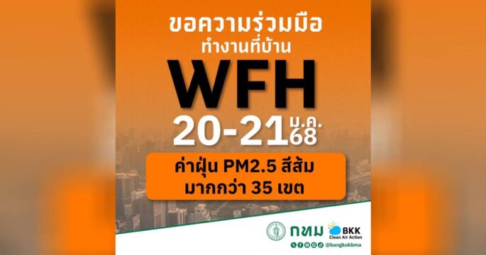 กทม. ประกาศขอความร่วมมือภาครัฐ-เอกชน WFH 20-21 ม.ค.68 คาดค่าฝุ่นสัปดาห์หน้าเป็นสีส้ม มีอัตราระบายลมต่ำ ด้านผู้บริหารโรงเรียน สั่งเปิด-ปิดได้ตามหลักเกณฑ์และดุลยพินิจ