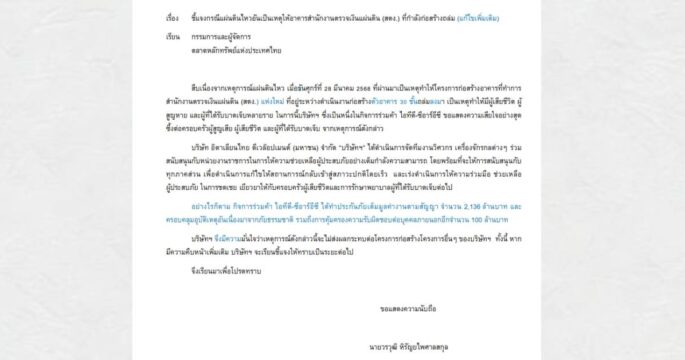 ไอทีดีแจ้ง ตลท. มั่นใจตึก สตง.ถล่มไม่กระทบโครงการอื่นๆ