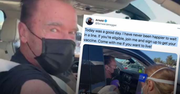 “คนเหล็กยังฉีดวัคซีน” อาร์โนลด์ ชวาร์เซเน็กเกอร์ อดีตผู้ว่าการรัฐแคลิฟอร์เนียและนักแสดงชื่อดัง ทวีตข้อความพร้อมคลิป หลังเข้ารับการฉีดวัคซีนโควิด-19 พร้อมเชิญชวนให้ทุกคนมาฉีดวัคซีน