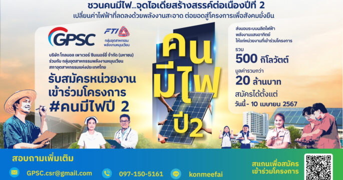 กรุงเทพฯ 1 มี.ค.-GPSC – กลุ่มอุตฯ พลังงานหมุนเวียน ส.อ.ท. เปิดรับสมัครองค์กรรัฐ และองค์กรเพื่อสังคม เข้าร่วมโครงการ “คนมีไฟ” ปีที่ 2 ส่งมอบแหล่งผลิตพลังงานสะอาดจากโซลาร์ ลดค่าใช้จ่ายด้านพลังงาน ยื่นสมัครได้ตั้งแต่วันนี้ – 10 เม.ย. 2567 ขยายผลความร่วมมือ สู่ 500 กิโลวัตต์ ใน 5 ปี กระตุ้นทุกภาคส่วนลดการปล่อยก๊าซคาร์บอนไดออกไซด์