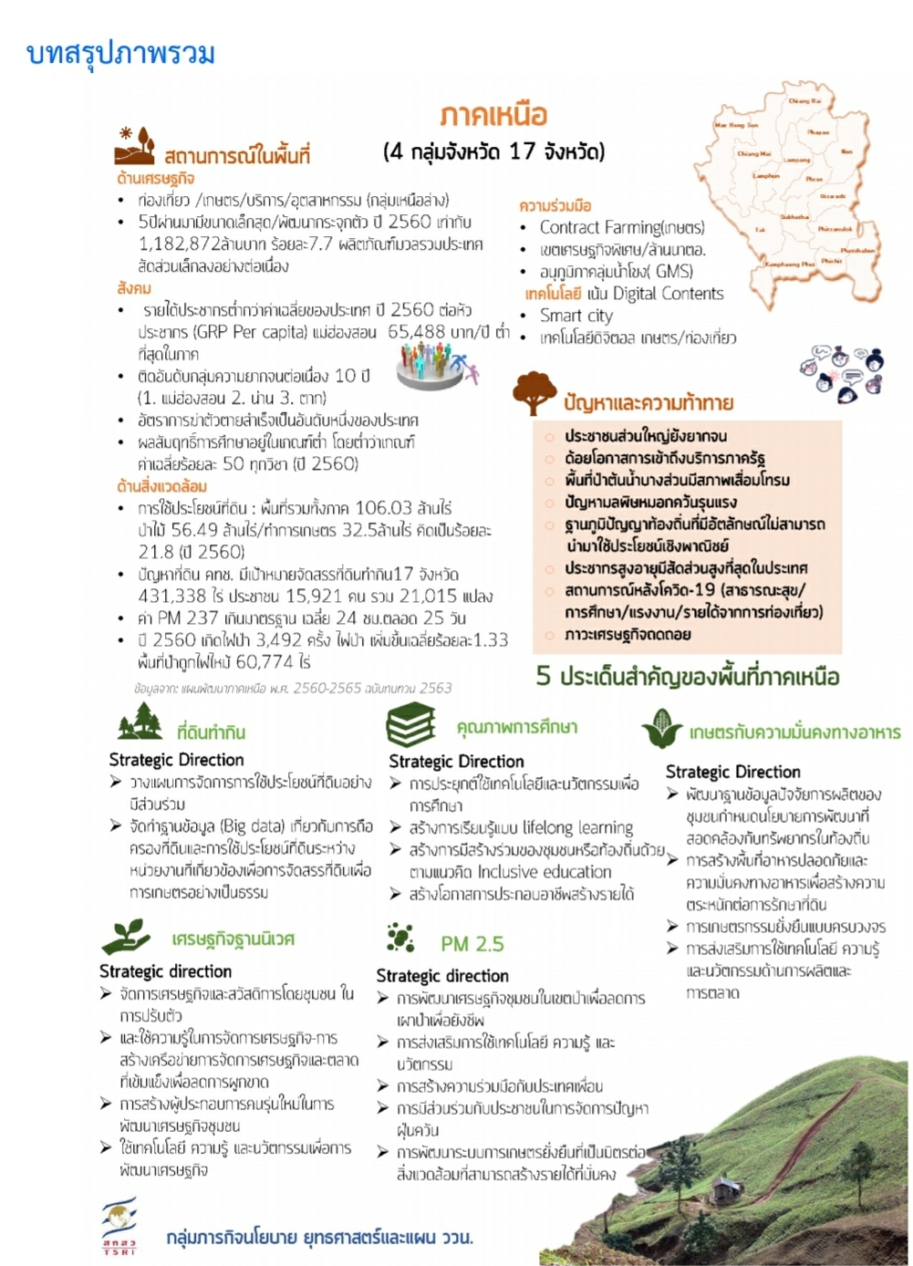 สกสว. จึงมีแนวคิดพัฒนาแผนวิทยาศาสตร์ วิจัยและนวัตกรรม ภูมิภาค: ภาคเหนือ ในระยะ 3 ปี (พ.ศ. 2565 – 2568) มุ่งเน้นแก้ปัญหาเชิงพื้นที่ 5 ประเด็นสำคัญ ประกอบด้วย 1. การถือครองที่ดินเพื่อการเกษตรลดลง 2. ระบบการศึกษาที่ไม่เท่าเทียมและไม่ตอบสนองท้องถิ่น 3. การพัฒนาระบบเกษตรที่ไม่เอื้อต่อความมั่นคงทางอาหาร 4. ขาดการพัฒนาระบบเศรษฐกิจชุมชนบนฐานนิเวศวัฒนธรรมและทรัพยากรธรรมชาติ 5. ค่า PM ที่สูงต่อเนื่อง เพื่อกำหนดทิศทางงานวิจัยที่สามารถสร้างสรรค์ผลงานวิจัยและนวัตกรรมตอบโจทย์แก้ไขปัญหาให้กับพื้นที่ได้อย่างแท้จริง