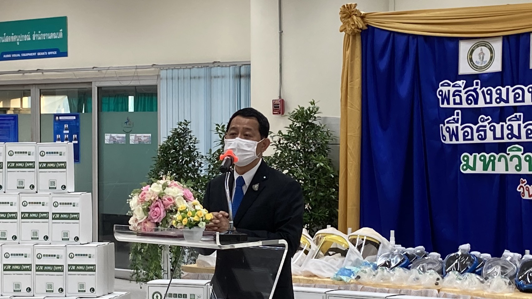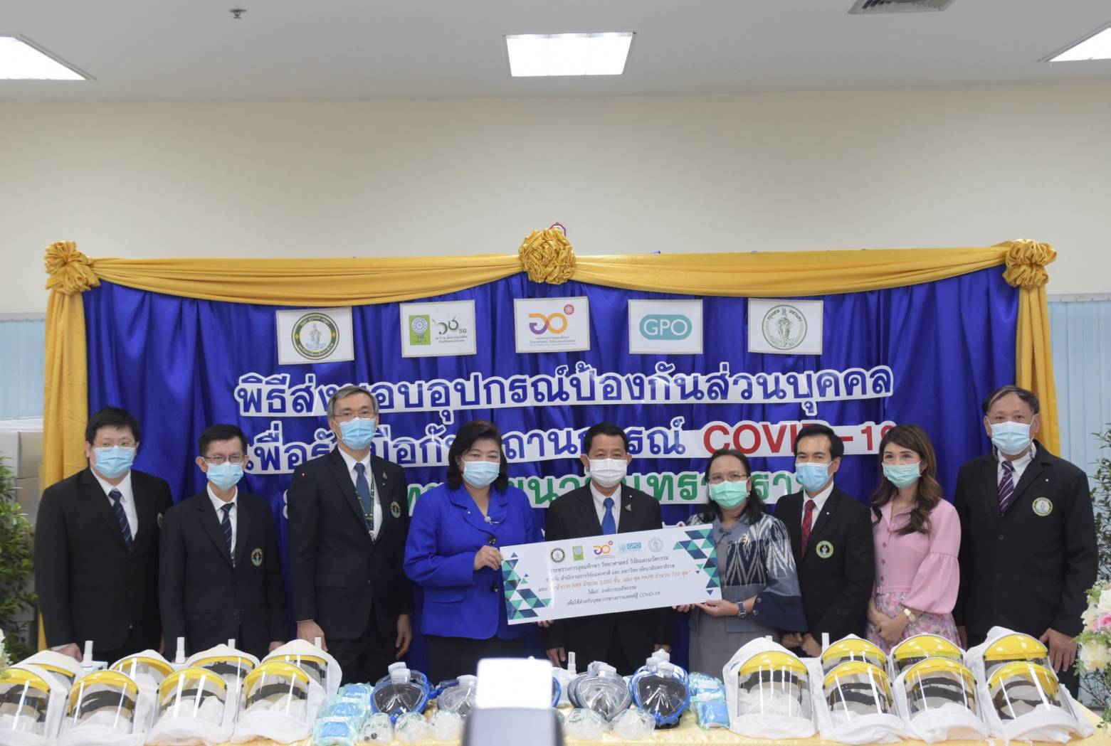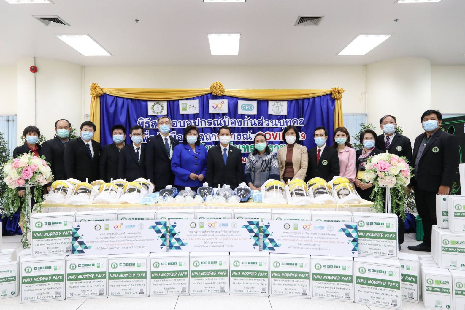 มหาวิทยาลัยนวมินทราธิราช มอบผลงานวิจัยหน้ากาก N99 จำนวน 4,000 ชิ้น และ ชุด PAPR จำนวน 1,000 ชุด ให้กระทรวงการอุดมศึกษา วิทยาศาสตร์ วิจัยและนวัตกรรม (อว.) และสำนักงานการวิจัยแห่งชาติ (วช.) เพื่อส่งมอบต่อให้หน่วยงานที่เกี่ยวข้องแจกจ่ายให้กับบุคลากรทางการแพทย์ในพื้นที่ต่างๆ ที่กำลังรับมือกับการระบาดของโควิด-19 รอบใหม่ในขณะนี้ โดยมีปลัดกระทรวง อว. และดร.วิภารัตน์ ดีอ่อง รักษาราชการแทนผู้อำนวยการสำนักงานการวิจัยแห่งชาติ รับและส่งมอบอุปกรณ์ในครั้งนี้