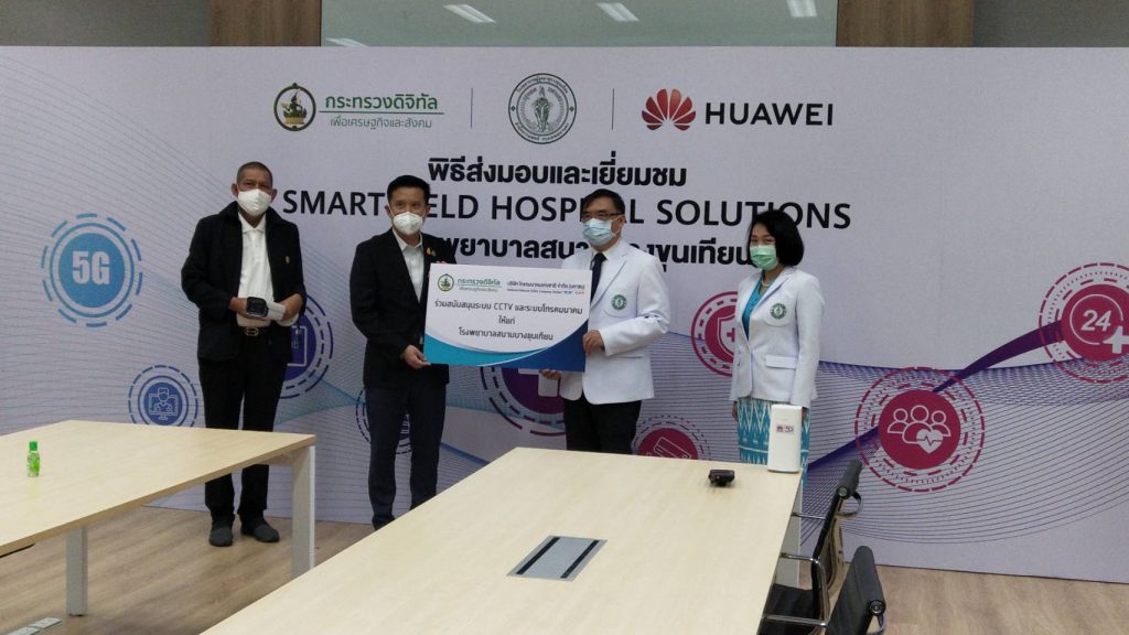 วันนี้ (1 พฤษภาคม 2564) นายชัยวุฒิ ธนาคมานุสรณ์ รัฐมนตรีว่าการกระทรวงดิจิทัล เพื่อเศรษฐกิจและสังคม (ดีอีเอส) พร้อมด้วย นาวาอากาศเอก สมศักดิ์ ขาวสุวรรณ์ กรรมการและรักษาการกรรมการผู้จัดการใหญ่ บริษัท โทรคมนาคมแห่งชาติ จำกัด (มหาชน) หรือ NT และนายอาเบล เติ้ง ประธานกรรมการบริหาร บริษัท หัวเว่ย เทคโนโลยี่ (ประเทศไทย) จำกัด ร่วมส่งมอบระบบสื่อสารโทรคมนาคม ระบบ เทเลเมดิซีน กล้องCCTV ชุด PPE และถุงยังชีพเพื่อมอบให้ผู้ป่วยโควิด-19 โดยมี นายศุภรัช สุวัฒนพิมพ์ ผู้อำนวยการโรงพยาบาลผู้สูงอายุบางขุนเทียน เป็นผู้รับมอบ ที่ขณะนี้ใช้เป็นโรงพยาบาลสนามรองรับดูแลรักษาผู้ป่วยโควิดจำนวน 1000 เตียง