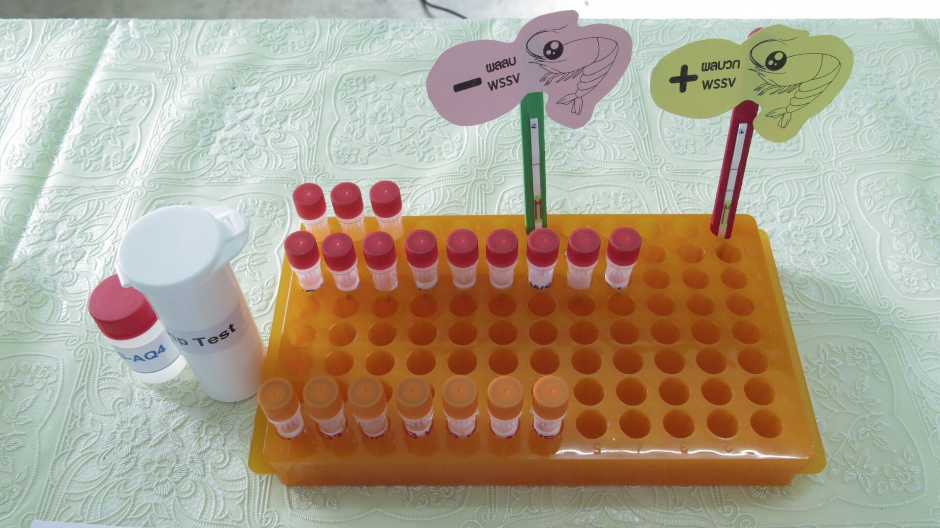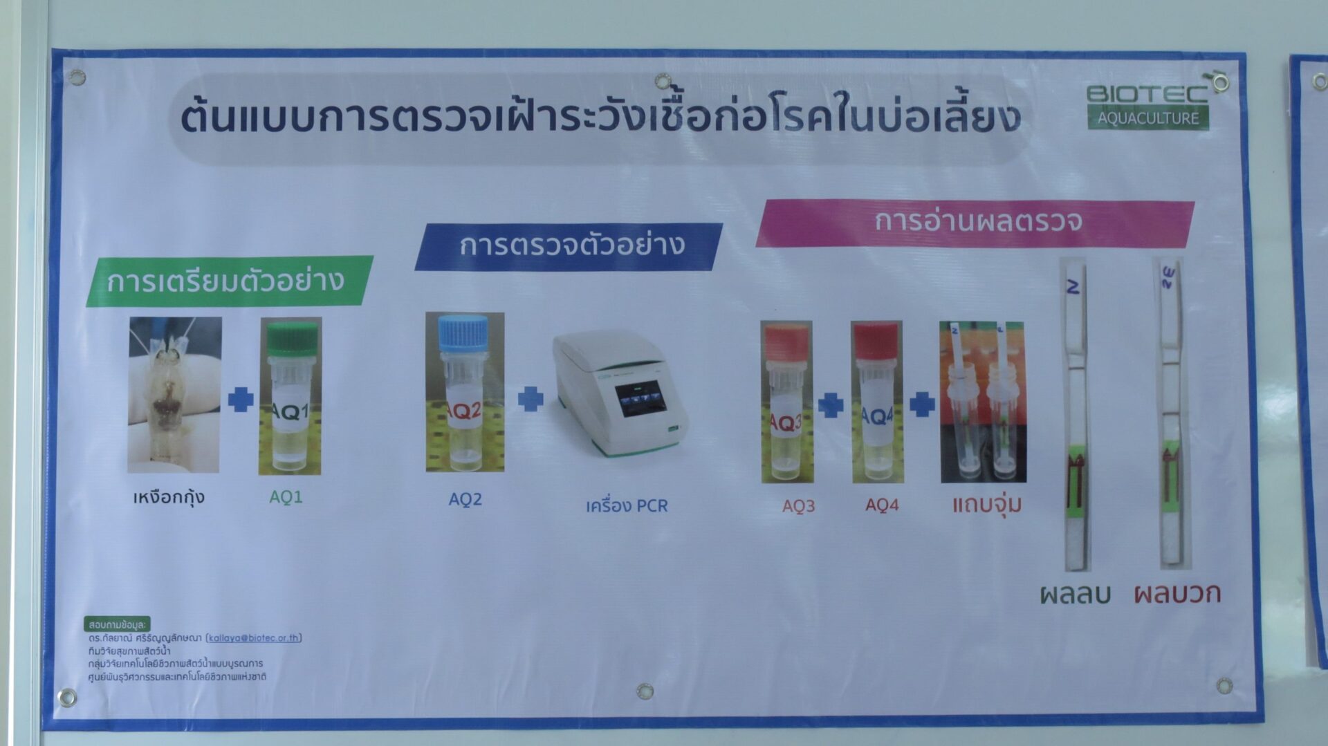 ไบโอเทค จึงได้พัฒนาชุดตรวจหาเชื้อก่อโรคในกุ้ง จากแบคทีรีย และไวรัส โดยมีวิธีการตรวจ 2 วิธี คือ ตรวจด้วยเนื้อเยื่อจากเหงือกของกุ้ง ทำมาผ่านขั้นตอน และทดสอบลงบนชุดตรวจคล้ายแผ่นตรวจครรภ์ หากปรากฎแทบ 2 ขีด แสดงว่ากุ้งมีการติดเชื้อก่อโรค หรือใช้วิธีการตรวจสอบคุณภาพดิน และน้ำ