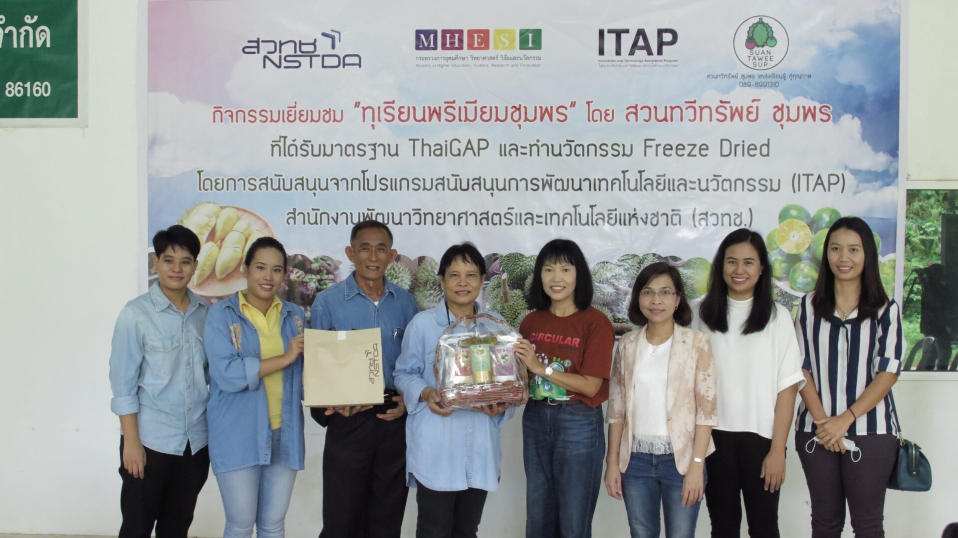 สำนักงานพัฒนาวิทยาศาสตร์และเทคโนโลยีแห่งชาติ (สวทช.) โดยโปรแกรมสนับสนุนการพัฒนาเทคโนโลยีและนวัตกรรม หรือไอแทปให้การสนับสนุนผู้เชี่ยวชาญแก่ผู้ประกอบการเกษตร “สวนทวีทรัพย์” จ.ชุมพร ในการพัฒนาสินค้าเกษตรด้วยวิทยาศาสตร์และเทคโนโลยี บนพื้นที่กว่า 100 ไร่ ยกระดับคุณภาพผลไม้หลากชนิด เช่น ทุเรียน ส้มโชกุน และมังคุด โดยเฉพาะทุเรียนของสวนทวีทรัพย์ได้รับการรับรองมาตรฐาน ThaiGAP ซึ่งเป็นมาตรฐานระบบการผลิตสินค้าเกษตรที่มีความปลอดภัยของภาคเอกชน ยกระดับสินค้าและผลิตภัณฑ์ทางการเกษตรของผู้ประกอบการ ตั้งแต่ต้นน้ำ ถึงปลายน้ำ