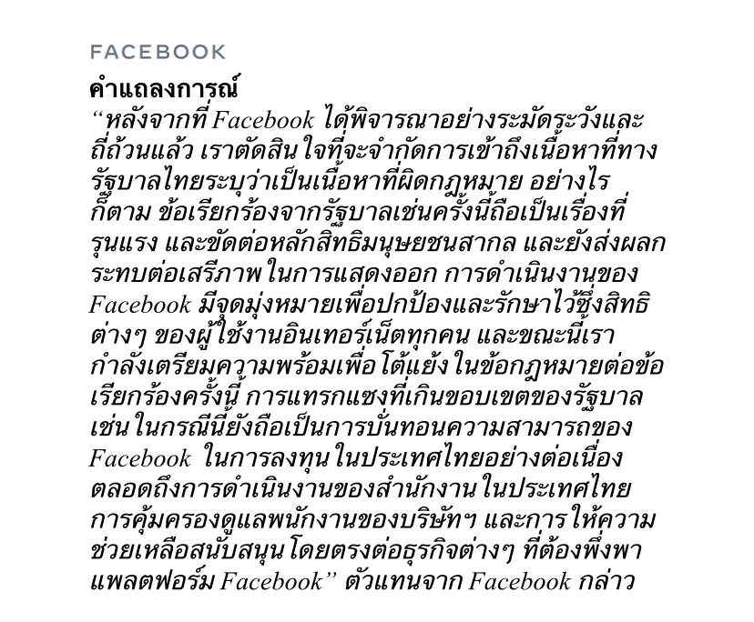 “หลังจากที่ Facebook ได้พิจารณาอย่างระมัดระวังและถี่ถ้วนแล้ว เราตัดสินใจที่จะจำกัดการเข้าถึงเนื้อหาที่ทางรัฐบาลไทยระบุว่าเป็นเนื้อหาที่ผิดกฎหมาย อย่างไรก็ตาม ข้อเรียกร้องจากรัฐบาลเช่นครั้งนี้ถือเป็นเรื่องที่รุนแรง และขัดต่อหลักสิทธิมนุษยชนสากล และยังส่งผลกระทบต่อเสรีภาพในการแสดงออก การดำเนินงานของ Facebook มีจุดมุ่งหมายเพื่อปกป้องและรักษาไว้ซึ่งสิทธิต่างๆ ของผู้ใช้งานอินเทอร์เน็ตทุกคน และขณะนี้เรากำลังเตรียมความพร้อมเพื่อโต้แย้งในข้อกฎหมายต่อข้อเรียกร้องครั้งนี้ การแทรกแซงที่เกินขอบเขตของรัฐบาลเช่นในกรณีนี้ยังถือเป็นการบั่นทอนความสามารถของ Facebook ในการลงทุนในประเทศไทยอย่างต่อเนื่อง ตลอดถึงการดำเนินงานของสำนักงานในประเทศไทย การคุ้มครองดูแลพนักงานของบริษัทฯ และการให้ความช่วยเหลือสนับสนุนโดยตรงต่อธุรกิจต่างๆ ที่ต้องพึ่งพาแพลตฟอร์ม Facebook”