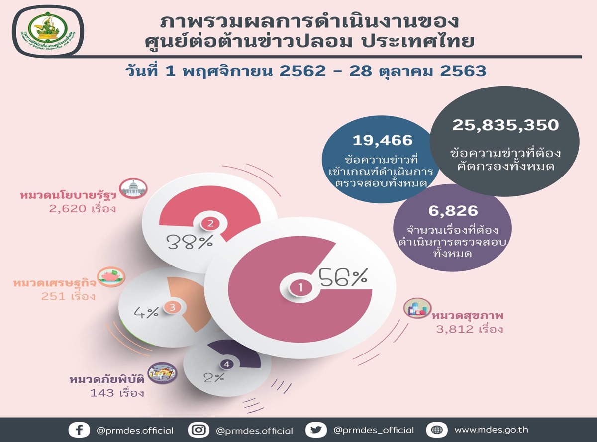 ศูนย์ต่อต้านข่าวปลอม ประเทศไทย (Anti-Fake News Center Thailand) ดำเนินการโดย กระทรวงดิจิทัลเพื่อเศรษฐกิจและสังคม (ดีอีเอส) รายงานภาพรวมผลการดำเนินงาน (1 พ.ย.62-28 ต.ค.63) จากการรวบรวมข้อมูลทั้งจากที่มีผู้แจ้งเบาะแสเข้ามา และระบบติดตามการสนทนาทางโซเชียล (Social listening) พบว่า มีจำนวนข้อความข่าวที่ต้องคัดกรองทั้งหมด 25,835,350 ข้อความ ข้อความข่าวที่เข้าเกณฑ์ดำเนินการตรวจสอบทั้งหมด 19,466 ข้อความ มีจำนวนเรื่องที่ต้องดำเนินการตรวจสอบทั้งหมด 6,826 เรื่อง โดยร้อยละ 56 เป็นข่าวในหมวดสุขภาพ 3,812 เรื่อง เรื่องเกี่ยวกับนโยบายรัฐร้อยละ 38 หรือจำนวน 2,620 เรื่อง เรื่องเกี่ยวกับเศรษฐกิจ 251 เรื่อง หรือร้อยละ4 และเรื่องเกี่ยวกับภัยพิบัติ143 เรื่อง หรือร้อยละ 2 -สำนักข่าวไทย.