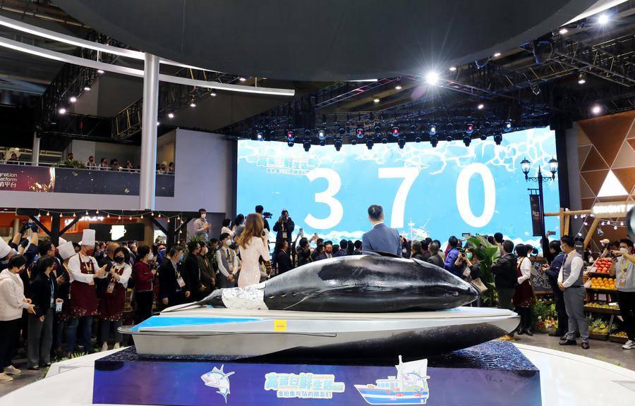 เซี่ยงไฮ้, 7 พ.ย. (ซินหัว) — ปลาทูน่าครีบน้ำเงินตัวใหญ่ยักษ์ถูกนำมาจัดแสดงในนิทรรศการอาหารและผลิตภัณฑ์การเกษตร ซึ่งเป็นส่วนหนึ่งของงานมหกรรมสินค้านำเข้านานาชาติจีน (CIIE) ครั้งที่ 5 ที่จัดขึ้น ณ ศูนย์นิทรรศการและการประชุมแห่งชาติ (เซี่ยงไฮ้) นครเซี่ยงไฮ้ทางตะวันออกของจีน โดยปลาทูน่าตัวนี้มีน้ำหนักสูงถึง 370 กิโลกรัม