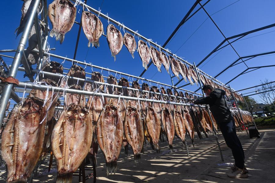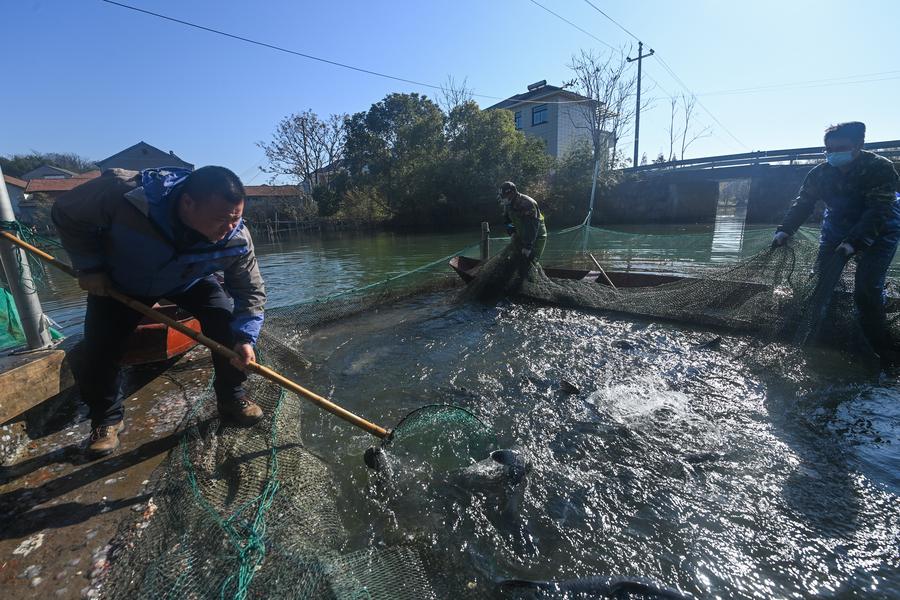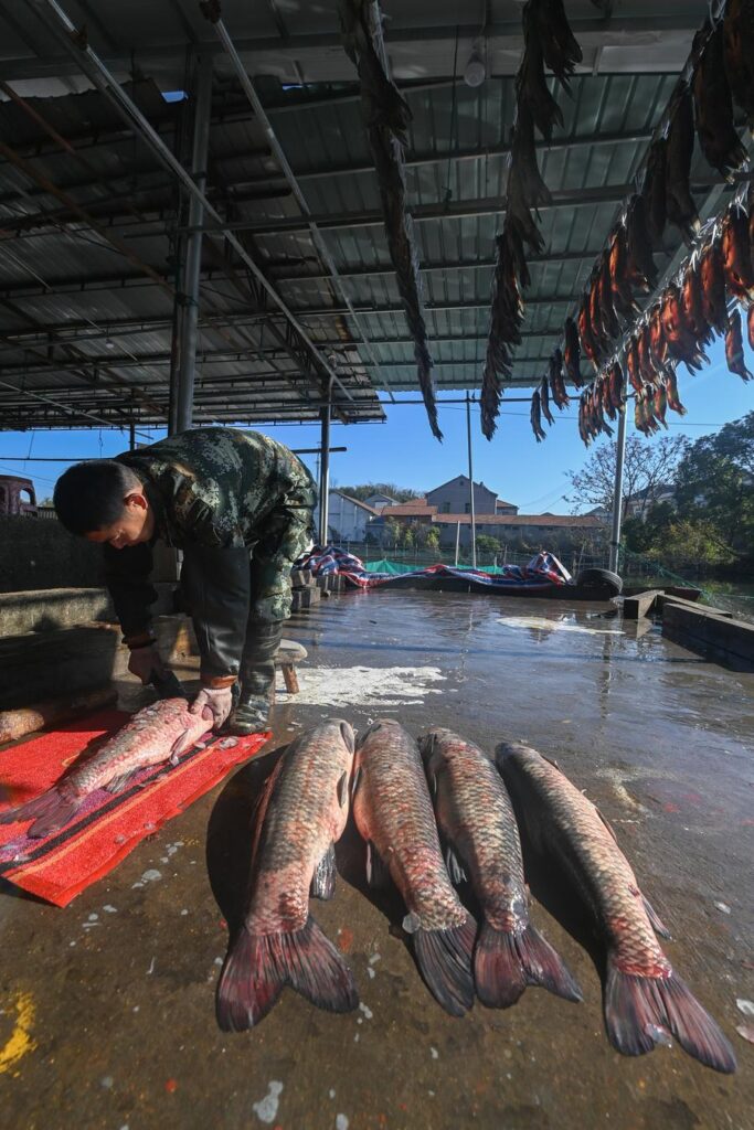 จูจี้, 20 ธ.ค. (ซินหัว) — ชาวบ้านริมทะเลสาบไป๋ถ่า ตำบลเตี้ยนโข่ว เมืองจูจี้ มณฑลเจ้อเจียงทางตะวันออกของจีน จับปลาดำ ปลาทรายแดง และปลาลายขาว ที่เลี้ยงไว้มาตากแดดตากลมทำปลาตากแห้งในช่วงใกล้สิ้นปี โดยปลาดำหนึ่งตัวมีน้ำหนักกว่า 5 กิโลกรัม และสามารถขายได้ราคากว่า 100 หยวน (ราวกว่า 499 บาท)