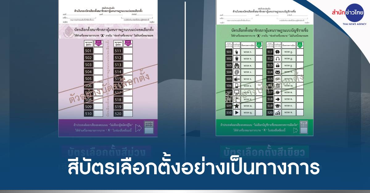กทม. 17 เม.ย.-กกต.เผยแพร่สีบัตรเลือกตั้งอย่างเป็นทางการแล้ว แบ่งเขตสีม่วง-บัญชีรายชื่อสีเขียว หลังทำสับสน เจอแซว “มีบัตรไหนที่เลือกไม่เอา กกต.ชุดนี้บ้าง”