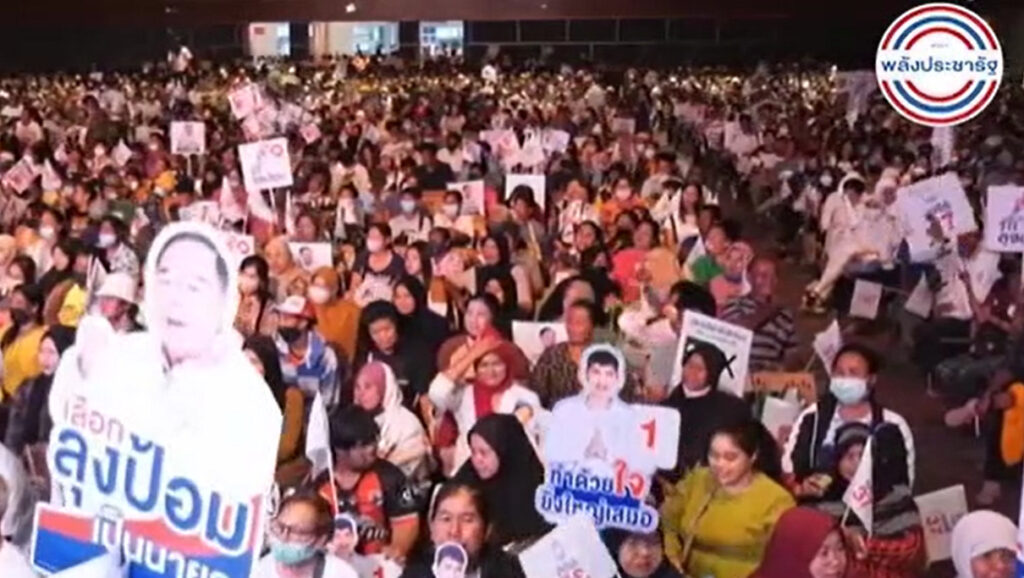 พรรคพลังประชารัฐ (พปชร.) ลงพื้นที่ จ.สงขลา เปิดเวทีปราศรัยใหญ่แห่งแรกของภาคใต้ ณ ศูนย์ประชุมนานาชาติสงขลา นำโดย พล.อ.ประวิตร วงษ์สุวรรณ รองนายกรัฐมนตรี และหัวหน้าพรรค พร้อมด้วยแกนนำพรรคประกอบด้วย นายสันติ พร้อมพัฒน์ เลขาธิการพรรค ร.อ.ธรรมนัส พรหมเผ่า ประธานยุทธศาสตร์การเลือกตั้งภาคเหนือ นายวิรัช รัตนเศรษฐ รองหัวหน้าพรรค ศ.ดร.นฤมล ภิญโญสินวัฒน์ เหรัญญิกพรรค ดร.คณิศ แสงสุพรรณ ทีมนโยบายพรรค นายนิพิฏฐ์ อินทรสมบัติ ผู้สมัคร ส.ส.บัญชีรายชื่อ และแกนนำภาคใต้ พร้อมด้วยผู้สมัคร ส.ส. จ.สงขลา ทั้ง 9 เขต ได้แก่ นายภวัต นิตย์โชติ เขต1 เบอร์ 7 นายอดิสัณห์ ชัยวิวัฒน์พงศ์ เขต 2 เบอร์ 6 นายอาทิตย์ สุวิทย์ เขต 3 เบอร์ 5 นายชนนพัฒฐ์ นาคสั้ว เขต 4 เบอร์ 1 นายญาณพง เพชรบูรณ์ เขต 5 เบอร์ 6 นายอนุกูล พฤกษานุศักดิ์ เขต 6 เบอร์ 5 นายธเนศ ล่องนาวา เขต 7 เบอร์ 7 นายธีรพงศ์ ดนสวี เขต 8 เบอร์ 3 และนายล่องหิ้น ทิพย์แก้ว เขต 9 เบอร์ 2 ซึ่งบรรยากาศเต็มไปด้วยประชาชนในจังหวัดและพื้นที่ข้างเคียง เข้าร่วมรับฟังนโยบายเต็มพื้นที่ กว่า 8,000 คน เต็มความจุศูนย์ประชุม เพราะครั้งนี้ถือเป็นการปราศรัยใหญ่ในพื้นที่ภาคใต้เป็นครั้งแรก ประชาชนต่างโบกธงให้กำลังใจ พร้อมประสานเสียงโห่ร้องเชียร์ เบอร์ 37 อย่างต่อเนื่อง