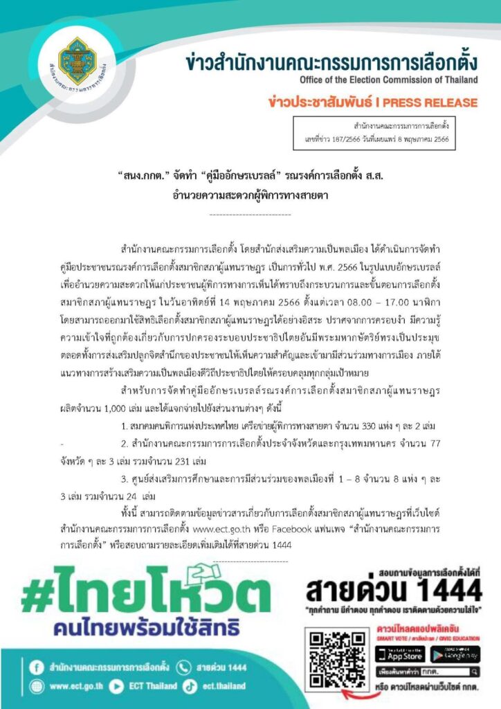 สำนักส่งเสริมความเป็นพลเมือง สำนักงานกรรมการการเลือกตั้ง(กกต.) ได้ดำเนินการจัดทำคู่มือประชาชนรณรงค์การเลือกตั้งสมาชิกสภาผู้แทนราษฎร ในรูปแบบอักษรเบรลล์เพื่ออำนวยความสะดวกให้แก่ประชาชนผู้พิการทางการเห็นได้ทราบถึงกระบวนการและขั้นตอนการเลือกตั้งส.ส. ในวันอาทิตย์ที่ 14 พฤษภาคม 2566 ตั้งแต่เวลา 08.00 – 17.00 น. โดยสามารถออกมาใช้สิทธิเลือกตั้งส.ส.ได้อย่างอิสระ ปราศจากการครอบงำ มีความรู้ความเข้าใจที่ถูกต้องเกี่ยวกับการปกครองระบอบประชาธิปไตยอันมีพระมหากษัตริย์ทรงเป็นประมุข ตลอดทั้งการส่งเสริมปลูกจิตสำนึกของประชาชนให้เห็นความสำคัญและเข้ามามีส่วนร่วมทางการเมือง ภายใต้แนวทางการสร้างเสริมความเป็นพลเมืองดีวิถีประชาธิปไตยให้ครอบคลุมทุกกลุ่มเป้าหมาย