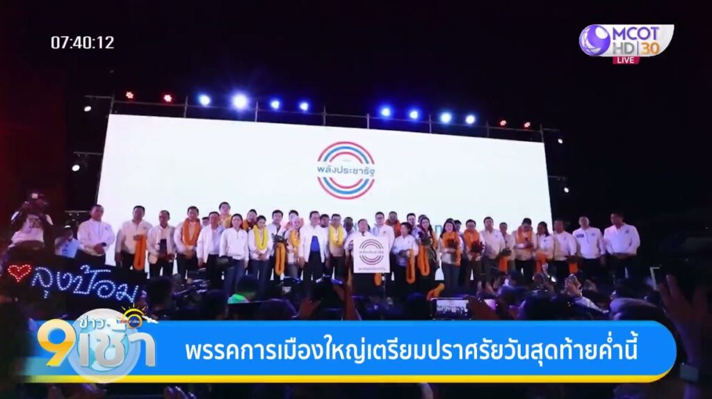 กรุงเทพฯ 12 พ.ค. – ทิ้งทวนวันสุดท้าย หลายพรรคการเมือง จัดปราศรัยใหญ่วันนี้ (12 พ.ค.) โดยพรรคเพื่อไทย ก้าวไกล พลังประชารัฐ รวมไทยสร้างชาติ ประชาธิปัตย์ ภูมิใจไทย และชาติพัฒนากล้า ปักหมุดพื้นที่ กทม.