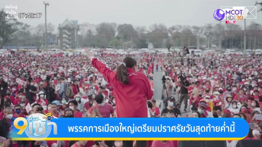 พรรคเพื่อไทย ประกาศรวมพลครั้งสุดท้าย ร่วมกันแสดงพลังเป็นครั้งสุดท้ายก่อน 2 เท้า 9 ไปแลนด์สไลด์ด้วยกัน ในวันเลือกตั้งครั้งสำคัญของประเทศไทยที่อิมแพค อารีนา เมืองทองธานี อ.ปากเกร็ด จ.นนทบุรี เริ่มเวลา 18.00 น. พร้อมทำคลิปรวบรวมภาพการปราศรัย ที่ไปพบเจอพี่น้องประชาชนทั่วประเทศมามากว่า 400 เวที หรือ ตลอดการปราศรัย 420 วัน ด้วย