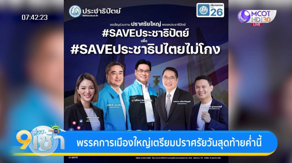 พรรคประชาธิปัตย์ จัดเวทีปราศรัยใหญ่ บริเวณ ลานคนเมือง กรุงเทพมหานคร เริ่มเวลา 17.00 น. งานนี้ จุรินทร์ ลักษณวิศิษฏ์ หัวหน้าพรรคและแคนดิเดตนายกฯ คนเดียวของพรรคนำทีม โดยมีอดีตหัวหน้าพรรค อย่าง อภิสิทธิ์ เวชชาชีวะ มาขึ้นเวทีปราศรัยครั้งนี้ด้วย