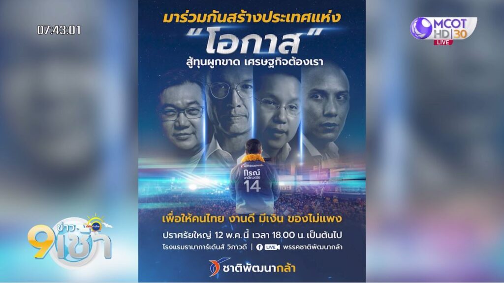 พรรคชาติพัฒนากล้า ปราศรัยใหญ่ที่โรงแรมรามาการ์เดนส์ ถนนวิภาวดี นำโดย นายกรณ์ จาติกวณิช หัวหน้าพรรคและ 1 ในแคนดิเดตนายกฯ ของพรรค ในธีม “มาร่วมสร้างประเทศแห่งโอกาส สู้ทุนผูกขาด เศรษฐกิจต้องเรา” จัดที่โรงแรมรามาการ์เดนส์ ถนนวิภาวดี ตั้งแต่เวลา 18.00 – 20.00 น.