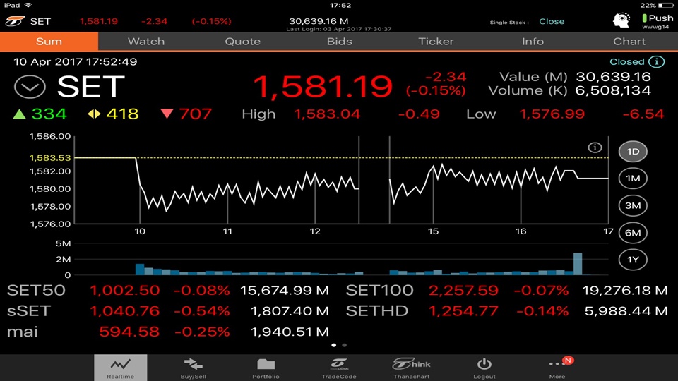 ผู้สื่อข่าวรายงานว่าวันนี้ (10 เม.ย.) ดัชนีตลาดหลักทรัพย์ฯ ปิดที่ระดับ 1,581.19 จุด ลดลง 2.34 จุด มูลค่าการซื้อขาย 30,639.16 ล้านบาท โดยดัชนีเคลื่อนไหวแดนลบตลอดทั้งวัน ขยับขึ้นแตะจุดสูงสุดของวันที่ระดับ 1,583.04 จุด และต่ำสุดที่ระดับ 1,576.99 จุด