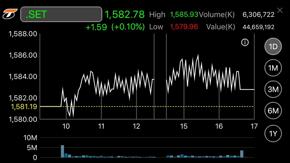 ผู้สื่อข่าวรายงานว่าวันนี้ (11 เม.ย.) ดัชนีตลาดหลักทรัพย์ฯ ปิดที่ระดับ 1,582.78 จุด เพิ่มขึ้น 1.59 จุด หรือร้อยละ 0.10 มูลค่าการซื้อขาย 44,659.12 ล้านบาท โดยดัชนีเคลื่อนไหวแดนบวกส่วนใหญ่ แตะจุดสูงสุด 1,585.93 จุด และต่ำสุดที่ระดับ 1,579.96 จุด