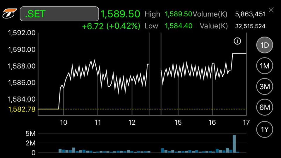 ผู้สื่อข่าวรายงานว่าวันนี้ (12 เม.ย.) ดัชนีหุ้นไทยปิดการซื้อขายที่ระดับ 1,589.50 จุด เพิ่มขึ้น 6.72 จุด หรือร้อยละ 0.42 มูลค่าการซื้อขาย 32,515.52 ล้านบาท โดยดัชนีเคลื่อนไหวแดนบวกตลอดทั้งวัน ขยับขึ้นแตะจุดสูงสุดของวันที่ระดับ 1,589.50 จุด และต่ำสุดที่ระดับ 1,584.40 จุด