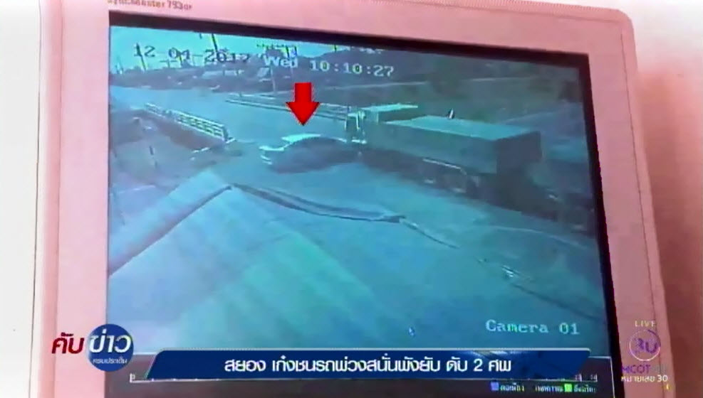 อยุธยา 12 เม.ย.-คลิปนาที รถเก๋งวิ่งมาทางสายรองพุ่งชนเสยหัวพ่วง 22 ล้อ กลางแยกผีสิง 100 ศพ อ.นครหลวง จ.อยุธยา ก่อนพุ่งตกสะพาน หนุ่มสาวมากับรถเก๋งตายคาที่ทั้งคู่