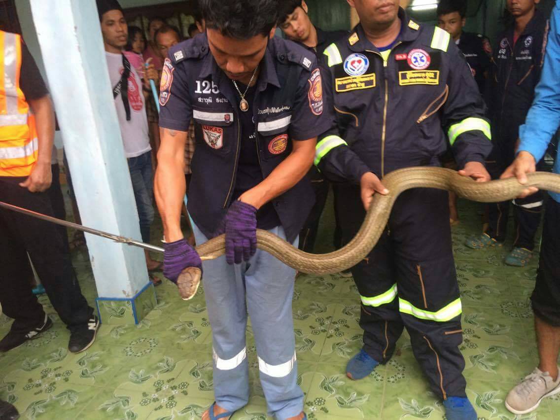 เมื่อไปถึงพบเจ้าของบ้านคือนายใจ มีสุวรรณ์ และนางประไพ มีสุวรรณ์ สองสามีภรรยา นำเจ้าหน้าที่กู้ภัยเข้าไปตรวจสอบภายในห้องครัวของบ้าน พบว่าเป็นงูจงอางขนาดใหญ่ เจ้าหน้าที่จึงช่วยกันใช้อุปกรณ์จับงูตัวดังกล่าว โดยใช้เวลาเพียงไม่ถึง 20 นาที ซึ่งงูจงอางยักษ์ตัวนี้มีความยาวกว่า 4 เมตร เจ้าหน้าที่จึงจับใส่กระสอบป่าน นำไปปล่อยในป่าลึกเพื่อคืนสู่ธรรมชาติต่อไป