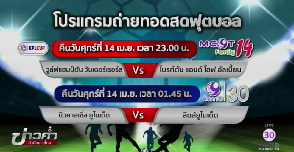 ส่วนอีกคู่ในคืนนี้ เวลา 23.00 น. วูล์ฟแฮมป์ตัน วันเดอร์เรอร์ส อันดับ 15 พบ ไบรท์ตัน แอนด์ โฮฟ อัลเบี้ยน จ่าฝูง ถ่ายทอดสดทางช่อง MCOT Family หมายเลข 14.-สำนักข่าวไทย
