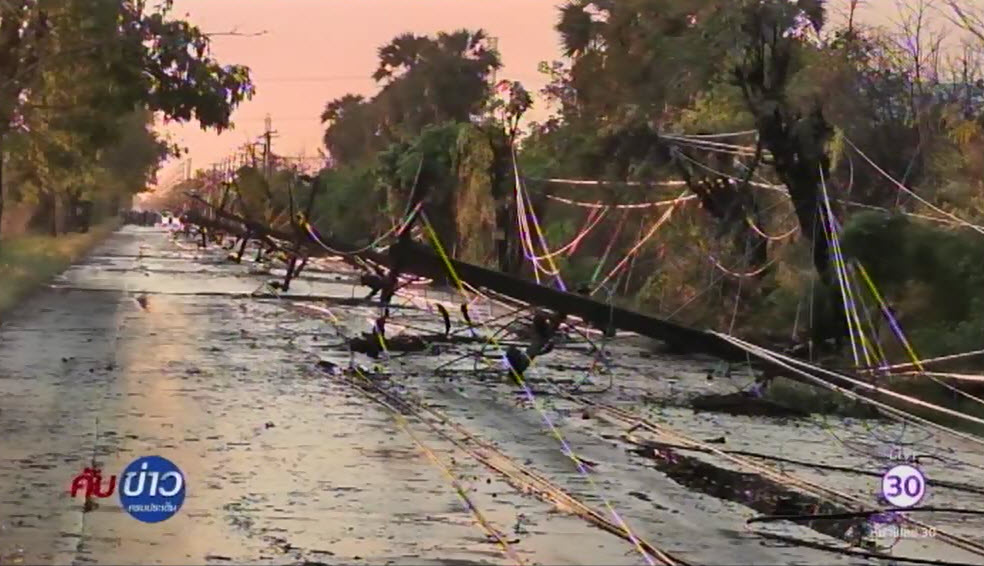 พิจิตร 14 เม.ย.-พายุฤดูร้อนพัดถล่ม อ.ตะพานหิน จ.พิจิตร เสาไฟฟ้าแรงสูงกว่า 60 ต้นล้มระเนระนาดกีดขวางจราจร ไฟดับหลายอำเภอ บ้านเรือนประชาชน 2 หมู่บ้านกว่า 50 หลังคาเรือนพังยับ