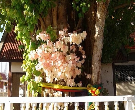 บรรยากาศภายในวัดศรีอุปลาราม หรือวัดหนองบัว อำเภอเมือง จังหวัดกาญจนบุรี ประชาชนเดินทางมาทำบุญอย่างต่อเนื่อง เพื่อเป็นสิริมงคลในโอกาสเทศกาลสงกรานต์หรือวันปีใหม่ไทย แต่บริเวณที่หลายคนให้ความสนใจอย่างมาก คือ ต้นโพธิ์เก่าแก่ มีใบสีขาวและสีชมพูอ่อน ๆ สวยงามมากออกมาจากช่วงกลางและโคนต้น ขณะที่ด้านบนต้นเป็นใบสีเขียวเข้ม ทำให้ประชาชนต่างถ่ายภาพเก็บไว้เป็นที่ระลึก และเชื่อว่าเป็นสิริมงคลหรือเป็นนิมิตหมายที่ดีของปีนี้และปีต่อ ๆ ไป