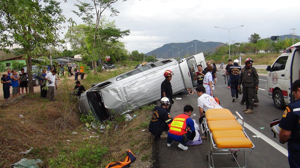 ลำปาง 18 เม.ย.- รถตู้พาพระสงฆ์-แม่ชี มุ่งหน้ากลับสำนัก ล้อยางแตกเสียหลักพลิกตะแคงริมถนนแม่ทะ-ลำปาง บาดเจ็บ 9 ราย
