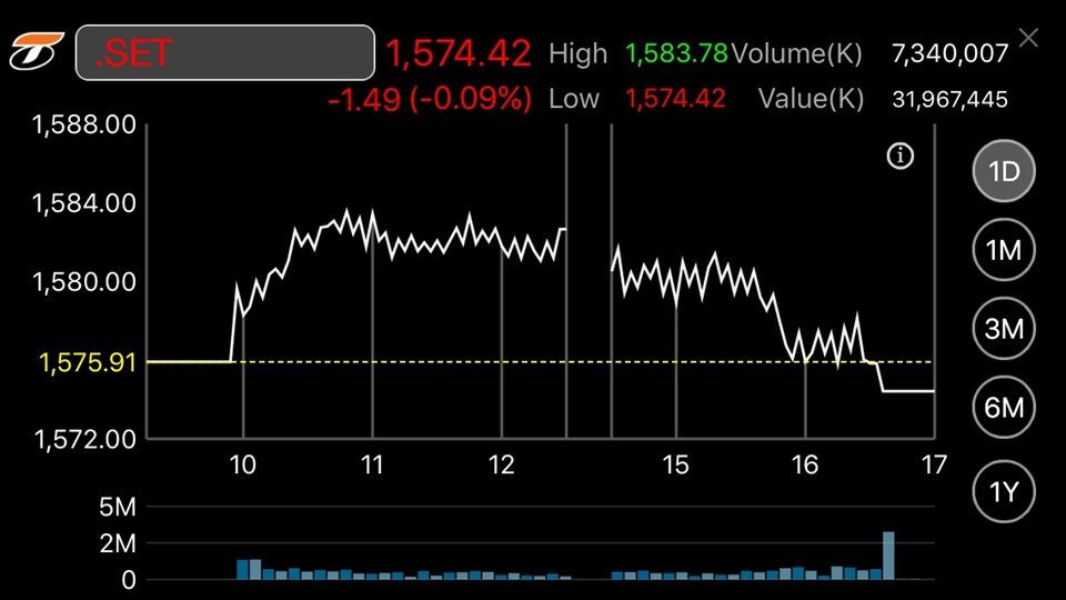 ผู้สื่อข่าวรายงานว่าดัชนีหุ้นไทยปิดการซื้อขายที่ระดับ 1,574.42 จุด ลดลง 1.49 จุด หรือร้อยละ 0.09 มูลค่าการซื้อขาย 31,967.45 ล้านบาท การเคลื่อนไหวของหุ้นไทยแกว่งตัว โดยช่วงเช้าปรับตัวสูงสุดที่ระดับ 1,583.78 จุด ตามตลาดหุ้นภูมิภาค หลังจากนักลงทุนเริ่มผ่อนคลายความตึงเครียดระหว่างสหรัฐและเกาหลีเหนือ แต่ดัชนีเริ่มอ่อนแรงช่วงใกล้ปิดตลาดต่ำสุดที่ระดับ 1,574.42 จุด