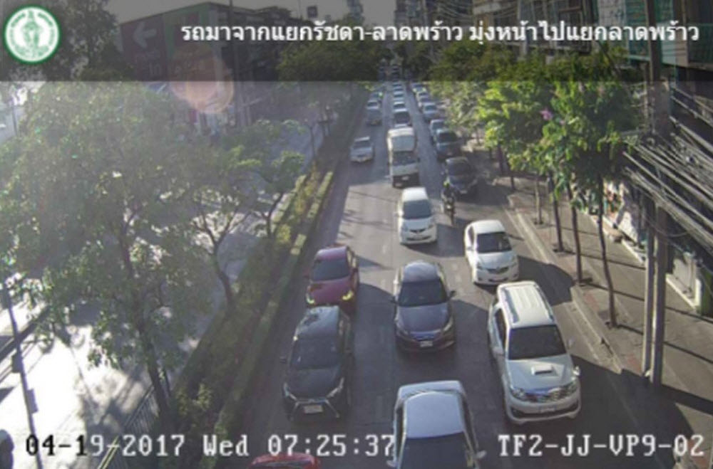 สภาพการจราจร ถนนลาดพร้าว ขาเข้า จากแยกรัชดา-ลาดพร้าว มุ่งหน้าเข้าปากทางลาดพร้าว ปริมาณรถมาก เคลื่อนตัวได้ช้า