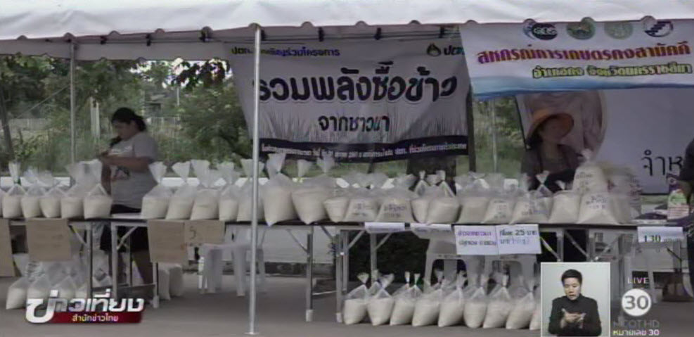 นี่เป็นภาพบรรยากาศการเปิดพื้นที่จำหน่ายข้าวถุงคุณภาพดี ส่งตรงจากชาวนาภาคตะวันออกเฉียงเหนือถึงมือผู้บริโภค ที่อาคารปฏิบัติการวิทยุและโทรทัศน์ บมจ.อสมท ซึ่งมีประชาชนให้ความสนใจเดินทางมาเลือกซื้อกันอย่างคึกคักตั้งแต่เช้า กิจกรรมนี้ บมจ.อสมท ร่วมกับ กรมส่งเสริมสหกรณ์ กระทรวงเกษตรและสหกรณ์ ช่วยเหลือชาวนาที่ได้รับกระทบจากราคาผลผลิตตกต่ำ ซึ่งนายพิเชษฐ์ วิริยะพาหะ รองอธิบดีกรมส่งเสริมสหกรณ์ ระบุว่า ข้าวที่นำมาจำหน่ายได้รับการตอบรับที่ดี โดยลอตแรกที่นำมาวางหมดในเวลาไม่ถึง 2 ชั่วโมง ทำให้ต้องนำลอต 2 มาเติมอีก 10 ตัน และคาดว่าจะขายหมดก่อนเวลา 15.00 น. วันนี้ พร้อมเผยอาจมีการเปิดตลาดจำหน่ายข้าวหลากหลายสายพันธุ์อีกครั้งในเดือนธันวาคมนี้