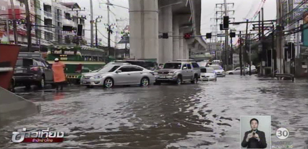 นี่เป็นภาพน้ำท่วมขังบน ถ.สุขุมวิท สายเก่า ตั้งแต่หน้าสถานีตำรวจภูธรสำโรงเหนือ ไปจนถึงหน้าช้างสามเศียร อ.เมืองสมุทรปราการ ทำให้รถยนต์ที่สัญจรไปมาต้องชะลอความเร็ว โดยเฉพาะช่วงแยกปู่เจ้าสมิงพราย ซึ่งเป็นพื้นที่ต่ำ มีน้ำท่วมสูงประมาณ 30 เซนติเมตร การจราจรติดขัดหลายกิโลเมตร ตำรวจ-ทหารต้องมาช่วยอำนวยการจราจรและช่วยเหลือรถที่ได้รับความเสียหายจากเครื่องยนต์ดับ พร้อมประชาสัมพันธ์ให้หลีกเลี่ยงเส้นทาง ทั้งนี้ เจ้าหน้าที่คาดว่า สาเหตุเบื้องต้นเกิดจากฝนตกหนักติดต่อกันหลายชั่วโมงช่วงเช้ามืด ประกอบกับภาวะน้ำทะเลหนุนสูง 2.90 เมตร ทำให้มีน้ำรอการระบายจำนวนมาก คาดว่าน้ำจะลดลงหลังเวลา 15.00 น.
