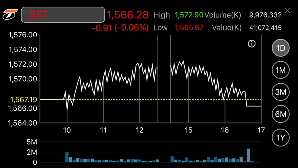 ผู้สื่อข่าวรายงานว่าวันนี้ (20 เม.ย.) ดัชนีตลาดหลักทรัพย์ฯ ปิดที่ระดับ 1,566.28 จุด ลดลง 0.91 จุด หรือร้อยละ 0.06 มูลค่าการซื้อขาย 41,072.42 ล้านบาท โดยดัชนีเคลื่อนไหวทั้งแดนบวก-ลบ ขยับขึ้นแตะจุดสูงสุดของวันที่ระดับ 1,572.90 จุด และต่ำสุดที่ระดับ 1,565.67 จุด