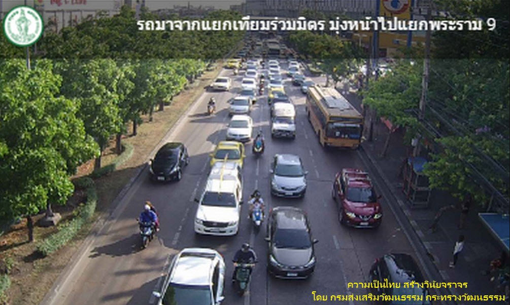 สภาพการจราจร ถนนรัชดาภิเษก ขาเข้า มุ่งหน้าแยกพระราม 9 ปริมาณรถมาก เคลื่อนตัวได้ช้า ท้ายชะลอตัวแยกเทียมร่วมมิตร