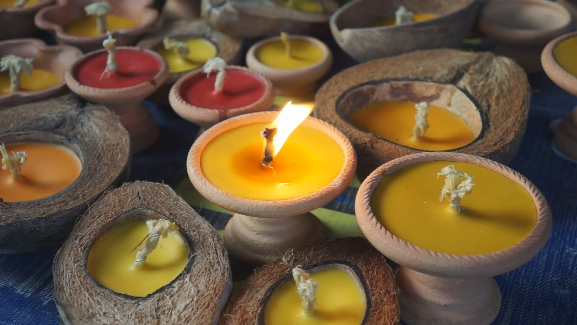 นายชัยรัตน์ และนางพรหมพร กล่าวว่า ไส้เทียนนั้นใช้ด้ายดิบมาหมุนดามด้วยลวดเส้นเล็ก ทำทรงแยกเป็นสามขาเหมือนตีนกา ตามคติความเชื่อที่ว่าการใช้ด้ายดิบฟั่นทำคล้ายกับตีนกา เพื่อใช้เป็นไส้เทียนจุดบูชาในวันเพ็ญขึ้น 15 ค่ำ เดือน 12 จะเป็นการแผ่กุศลไปให้บรรพบุรุษที่ล่วงลับไปแล้ว.-สำนักข่าวไทย