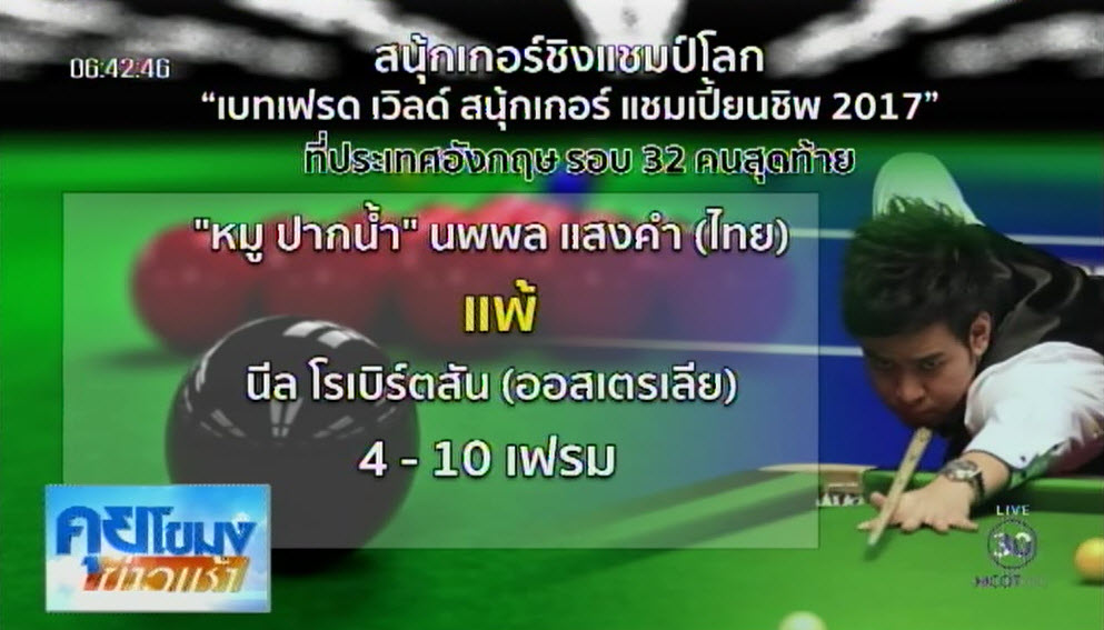 สนุ้กเกอร์ชิงแชมป์โลก “เบทเฟรด เวิลด์ สนุ้กเกอร์ แชมเปี้ยนชิพ 2017” ที่ครูซิเบิ้ล เธียเตอร์ ในเมืองเชฟฟิลด์ ประเทศอังกฤษ รอบ 32 คนสุดท้าย ใช้ระบบชนะ 10 ใน 19 เฟรม “หมู ปากน้ำ” นพพล แสงคำ นักสนุ้กเกอร์มือ 72 ของโลกชาวไทย พบกับ “จิงโจ้มหาประลัย” นีล โรเบิร์ตสัน มือ 9 ของรายการที่มีดีกรีเป็นถึงแชมป์โลกปี ค.ศ. 2010 จากออสเตรเลีย ซึ่งเซสชันแรก นพพล ตามหลังอยู่ถึง 1-8 เฟรมก่อนที่จะมาแพ้อีกในเซสชันที่ 2 ด้วย 4-10 เฟรม ทำให้ นีล โรเบิร์ตสัน เอาชนะ นพพล แสงคำ ไปได้อย่างงดงาม 10-4 เฟรม เข้ารอบ 16 คนสุดท้ายไปดวลกับ มาร์โก ฟู มือ 8 จากฮ่องกงต่อไป.-สำนักข่าวไทย