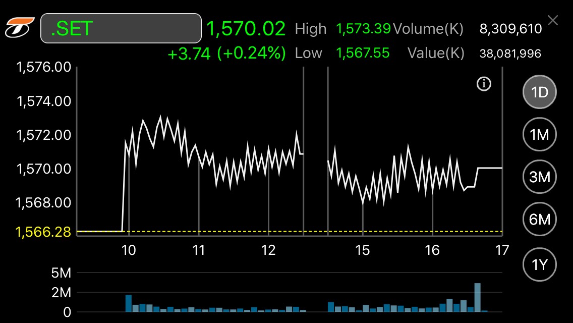 ตลาดหลักทรัพย์ปิดตลาดช่วงบ่ายวันนี้ที่ระดับ 1,570.02 จุด เพิ่มขึ้น 3.74 จุด (+0.24%) มูลค่าการซื้อขาย 38,082.00 ล้านบาท