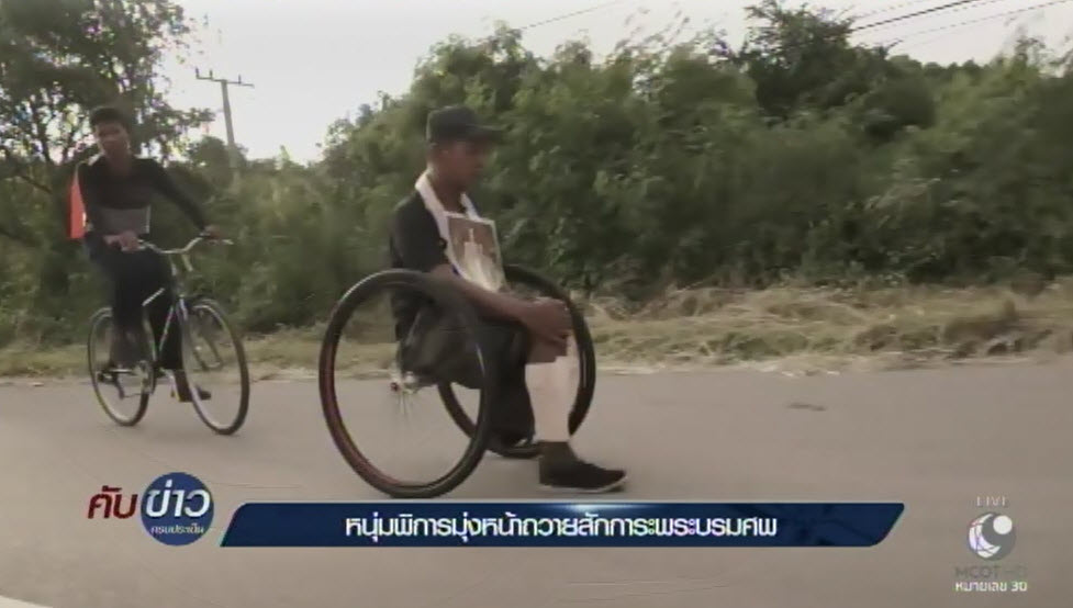สมุทรสงคราม 7 พ.ย.-หนุ่มใหญ่วัย 48 ปี พิการแขนและขาใจสู้ นั่งเหล็กพาด 2 ล้อจากภูเก็ตใช้เท้าถีบพื้นเดินทางเข้าพระบรมมหาราชวัง เพื่อกราบสักการะพระบรมศพ