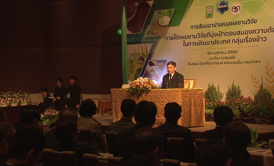 สำนักงานคณะกรรมการวิจัยแห่งชาติ (วช.) จัดการสัมมนานำเสนอผลงานวิจัยเรื่องข้าว โดยมีพลอากาศเอกประจิน จั่นตอง รองนายกรัฐมนตรี เป็นประธานเปิดการสัมมนา พร้อมบรรยายพิเศษ เรื่อง “แนวทางการพัฒนาผลิตภัณฑ์ข้าวอย่างครบวงจร” โดยระบุว่าจากสถานการณ์ข้าวปัจจุบันมีสตอกข้าวสูง ชาวนาขายข้าวราคาถูก ประกอบกับการแข่งขันตลาดข้าวโลก ทำให้ประเทศไทยสูญเสียส่วนแบ่งทางการตลาดให้แก่คู่แข่ง ซึ่งจากการศึกษาจุดอ่อนของข้าวไทยพบว่ามีต้นทุนการผลิตสูง คุณภาพลดลง ไม่มีการแปรรูปเป็นผลิตภัณฑ์ต่าง ๆ ทางออกของข้าวไทยภายใต้ความท้าทาย Thailand 4.0 ทำให้หน่วยงานเจ้าภาพและหน่วยงานที่เกี่ยวข้องต้องร่วมมือกันผลักดันและขับเคลื่อนให้ข้าวไทยสามารถแข่งขันและยั่งยืนได้ในตลาดโลก