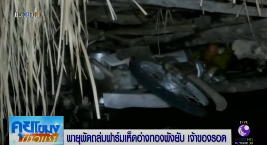อ่างทอง 26 เม.ย.-พายุฤดูร้อนพัดถล่มฟาร์มเห็ดในจังหวัดอ่างทอง หลังคาโรงเรือนพังมาทับตู้แขวนพระบรมฉายาลักษณ์ในหลวงรัชกาลที่ 9 บังเจ้าของไม่ให้โดนทับรอดตายหวุดหวิด