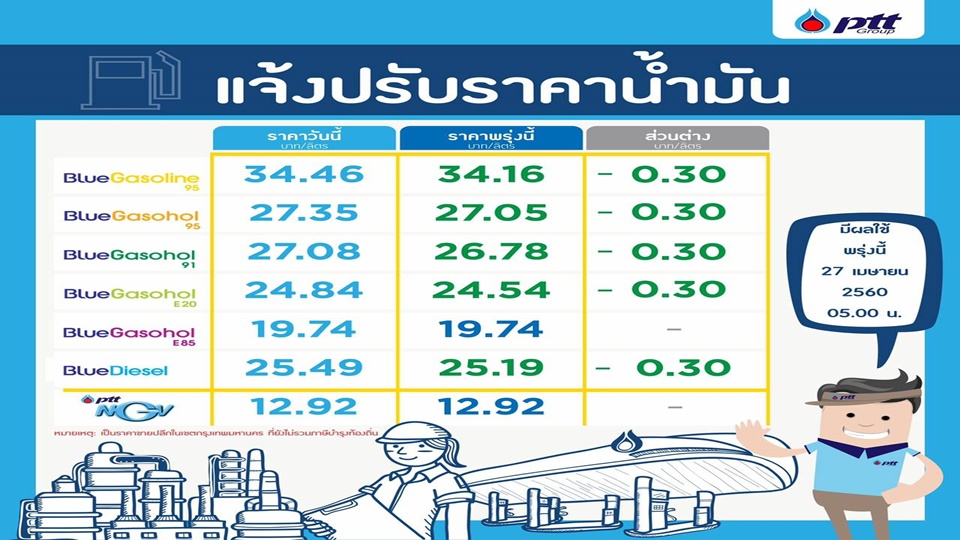 กรุงเทพฯ 26 เม.ย. – ผู้สื่อข่าวรายงานว่า บมจ.ปตท.และ บมจ.บางจากฯ ประกาศปรับลดราคาขายปลีกน้ำมันทุกชนิด 30 สตางค์/ลิตร ยกเว้น E85 คงเดิม มีผลพรุ่งนี้ (27 เม.ย.) เวลา 05.00 น. ราคาใหม่เป็นดังนี้ เบนซิน 95 อยู่ที่ 34.16 บาท/ลิตร แก๊สโซฮอล์ 95 อยู่ที่ 27.05 บาท/ลิตร แก๊สโซฮอล์ 91 อยู่ที่ 26.78 บาท/ลิตร E20 อยู่ที่ 24.54 บาท/ลิตร E85 อยู่ที่ 19.74 บาท/ลิตร และดีเซล 25.19 บาท/ลิตร (ราคานี้ยังไม่รวมภาษีท้องที่ของแต่ละจังหวัด).-สำนักข่าวไทย
