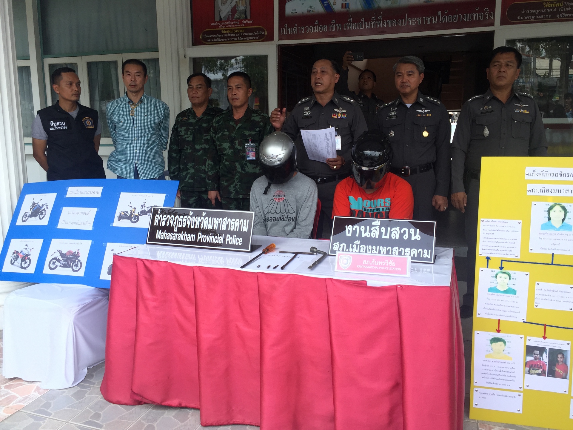 พล.ต.ต.อภิศักดิ์ เดชะคำภู ผู้บังคับการตำรวจภูธรจังหวัดมหาสารคาม แถลงข่าวจับกุม 2 ผู้ต้องหาชาย อายุ 20 และ 22 ปี ในข้อกล่าวหาร่วมกันลักทรัพย์ในเวลากลางคืน พร้อมของกลางรถยนต์ ทะเบียน 2 กพ 9716 กทม. รถจักรยานยนต์ไม่ติดแผ่นป้ายทะเบียน ประแจบล็อกรูปตัวที และเหล็กแหลม เนื่องจากช่วง 3-4 เดือนที่ผ่านมา มีคดีลักรถจักรยานยนต์ในพื้นที่เกิดขึ้นกว่า 30 ครั้ง ผู้เสียหายส่วนใหญ่เป็นนิสิตนักศึกษาตามหอพักในเขต อ.เมืองมหาสารคาม และ อ.กันทรวิชัย จากการสอบสวนผู้ต้องหาทั้งสองสารภาพว่า มีเพื่อนร่วมก่อเหตุอีก 3 คน ตระเวนก่อเหตุทั้งในพื้นที่ จ.ร้อยเอ็ด บุรีรัมย์ ขอนแก่น มหาสารคาม ขโมยรถมากว่า 100 คัน เลือกเฉพาะรถจักรยานยนต์ที่มีราคาแพง จากนั้นจะส่งไปขายในฝั่งประเทศเพื่อนบ้าน คันละ 10,000-20,000 บาท