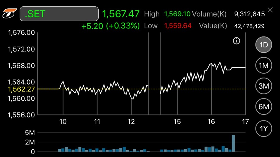 ผู้สื่อข่าวรายงานว่าดัชนีตลาดหุ้นไทยปิดการซื้อขายที่ระดับ 1,567.47 จุด เพิ่มขึ้น 5.20 จุด หรือร้อยละ 0.33 มูลค่าการซื้อขาย 42,478.43 ล้านบาท โดยดัชนีเคลื่อนไหวสลับแดนบวกและลบ ดัชนีสูงสุดที่ระดับ 1,569.10 จุด และต่ำสุดที่ระดับ 1,559.64 ล้านบาท โดยปัจจัยที่มีอิทธิพลยังเป็นปัจจัยต่างประเทศ คือ มาตรการปฏิรูปภาษีของนายโดนัลด์ ทรัมป์ ที่จะประกาศออกมาวันนี้ (26 เม.ย.) โดยเฉพาะเรื่องการลดภาษีนิติบุคคลเหลือร้อยละ 15 จากเดิมร้อยละ 35